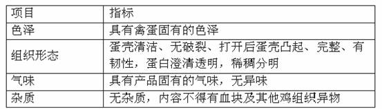 為貫徹預(yù)防為主的方針和執(zhí)行《中華人民共和國(guó)食品衛(wèi)生法》,加強(qiáng)對(duì)蛋與蛋制品的衛(wèi)生管理,提高蛋品質(zhì)量,保障人民身體健康,國(guó)家制定了蛋品衛(wèi)生標(biāo)準(zhǔn)。按照衛(wèi)生部提出的、原技術(shù)監(jiān)督局《鮮蛋衛(wèi)生標(biāo)準(zhǔn)》(GB2748—2003),鮮蛋的感官指標(biāo)和理化指標(biāo)應(yīng)達(dá)到下列要求。