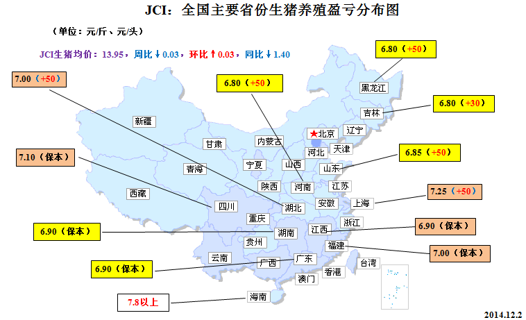 來自中國(guó)農(nóng)業(yè)部最新發(fā)布的統(tǒng)計(jì)報(bào)告--《2014年11月第2周(總第46周)畜產(chǎn)品、飼料集市價(jià)格》顯示,截至11月12日,全國(guó)生豬市場(chǎng)均價(jià)在14.10元/公斤,仔豬均價(jià)為21.51元/公斤,豬肉均價(jià)為23.19元/公斤,較10月均值分別下跌2.22%、8.19%和1.75%。盡管11月份我國(guó)生豬、仔豬和豬肉(白條肉)市場(chǎng)價(jià)格呈現(xiàn)全面回調(diào)格局,但是由于國(guó)內(nèi)豆粕、玉米包括相關(guān)飼料原料成本近來明顯回落,生豬價(jià)跌勢(shì)相對(duì)于飼料成本降幅較為溫和,全國(guó)大多數(shù)地區(qū)的養(yǎng)殖戶(場(chǎng))仍然維持保本或微利狀態(tài)。如前文所述,進(jìn)入12月份我國(guó)生豬市場(chǎng)依然存在需求推動(dòng)型的反彈空間。